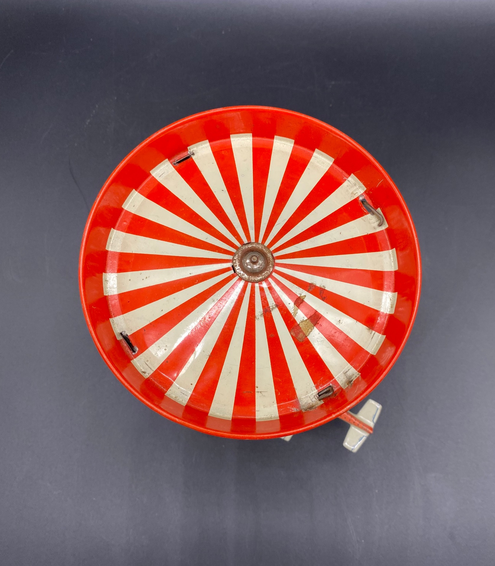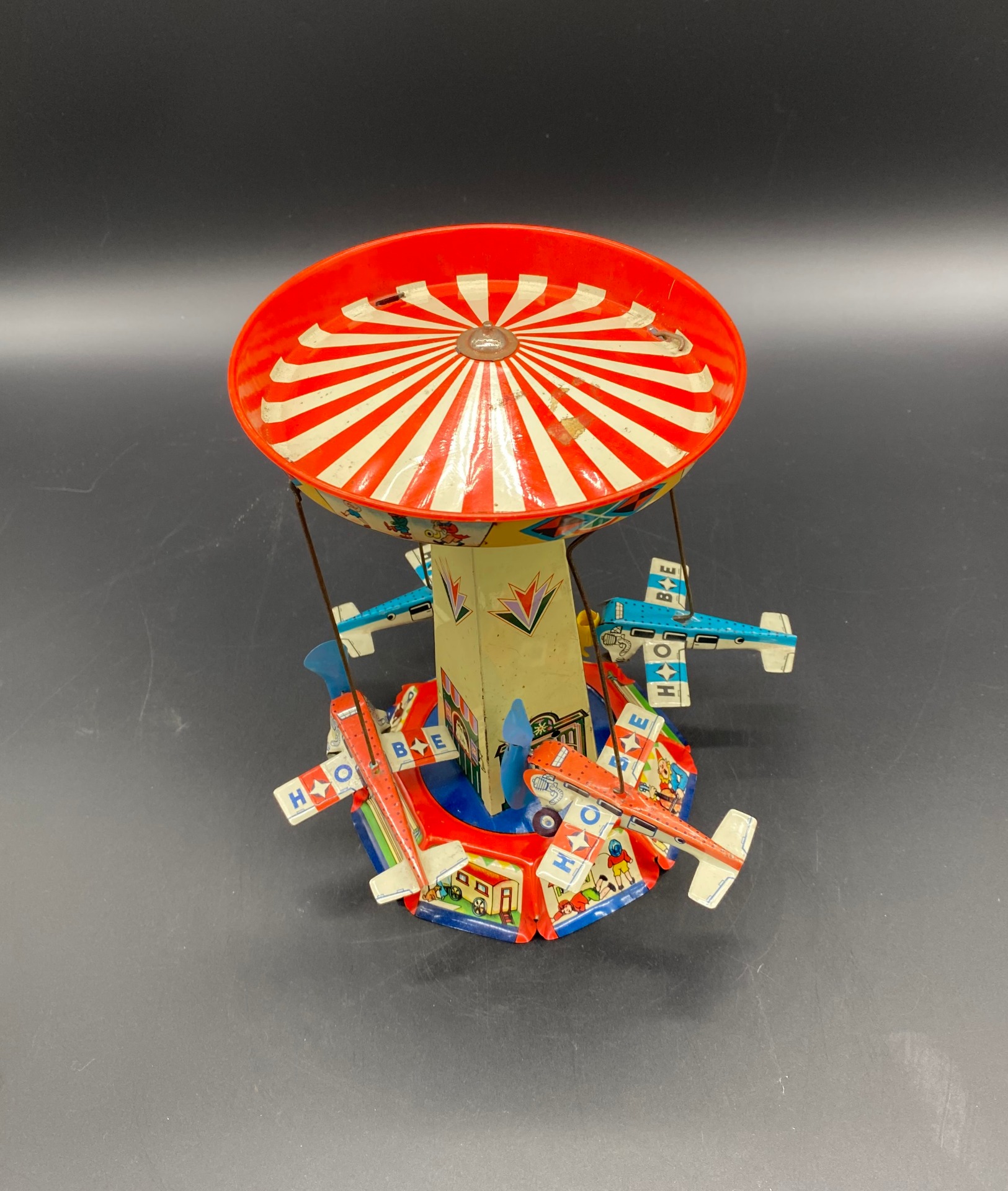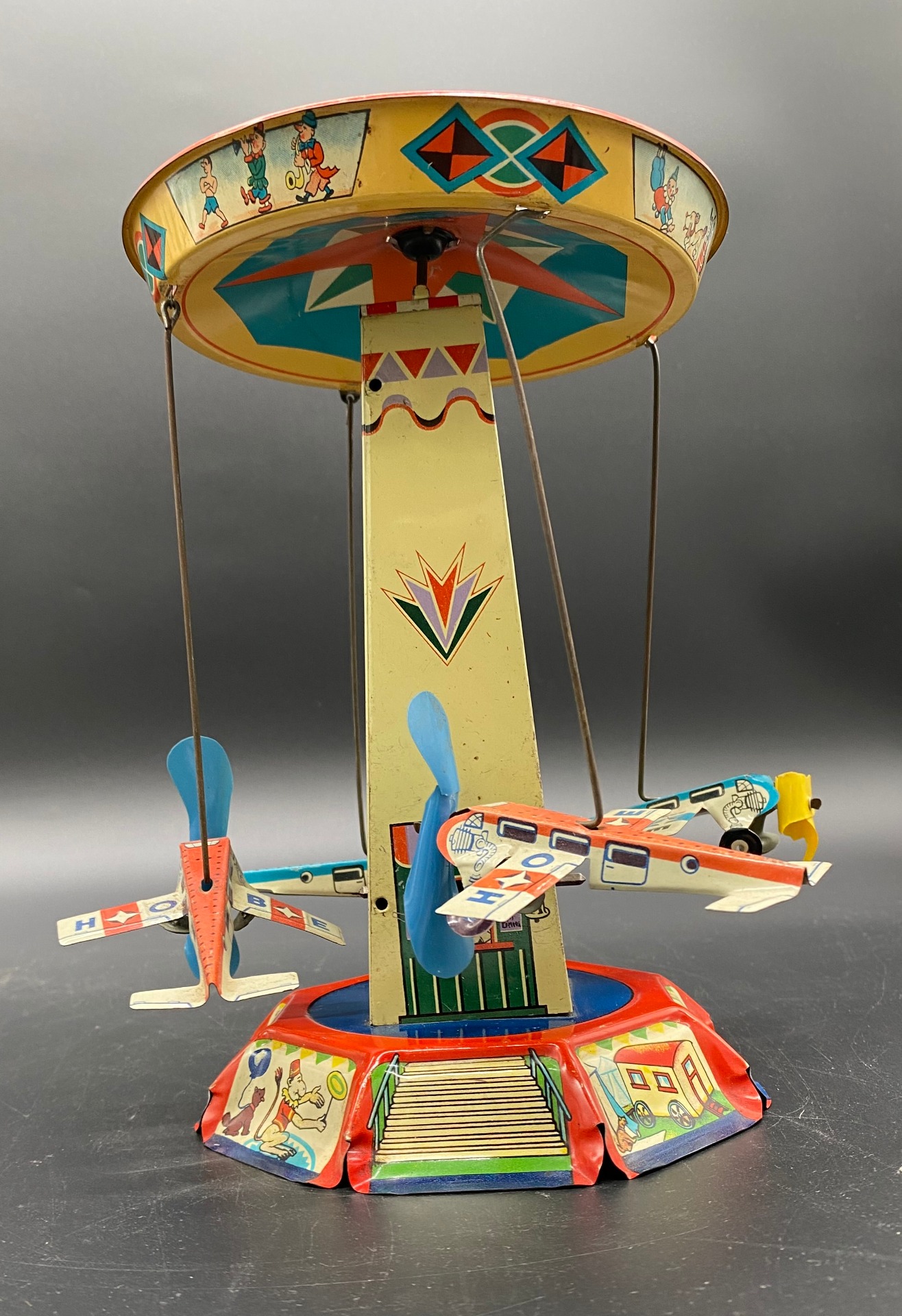 Deze prachtige antieke vliegtuigcarrousel van Hoch & Beckmann uit Duitsland is een zeldzame blikvanger die nostalgie en vakmanschap samenbrengt. Met zijn verfijnde metalen constructie, originele verfaccenten en kenmerkende mechaniek ademt dit stuk de speelse elegantie van vroeg-20e-eeuwse Duitse speelgoedtraditie. H=22 cm