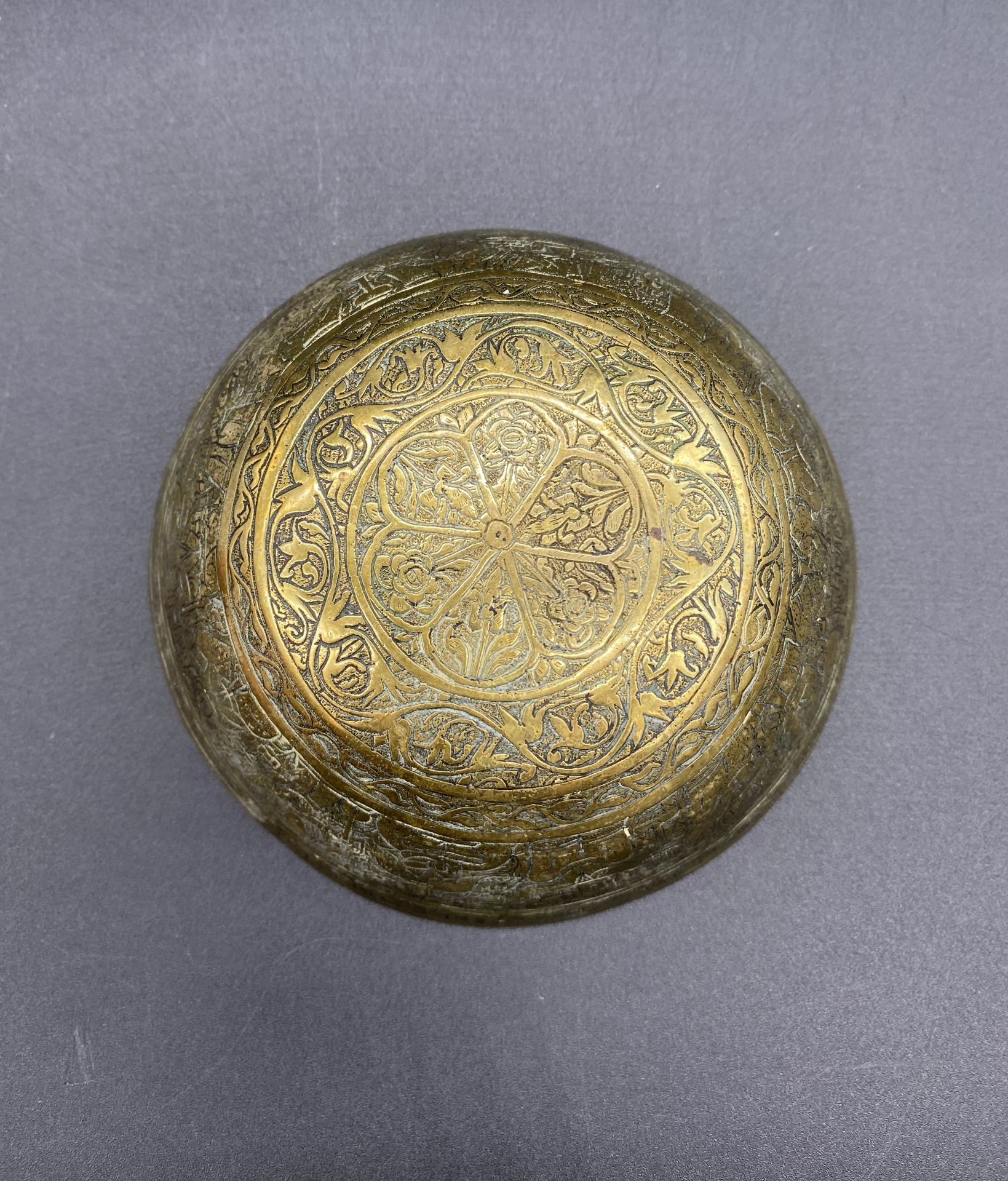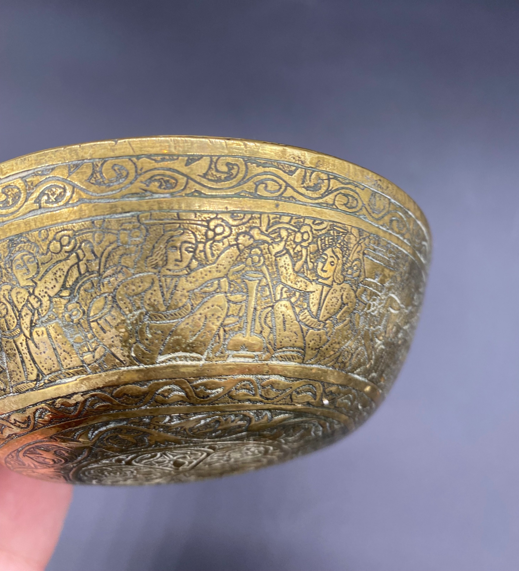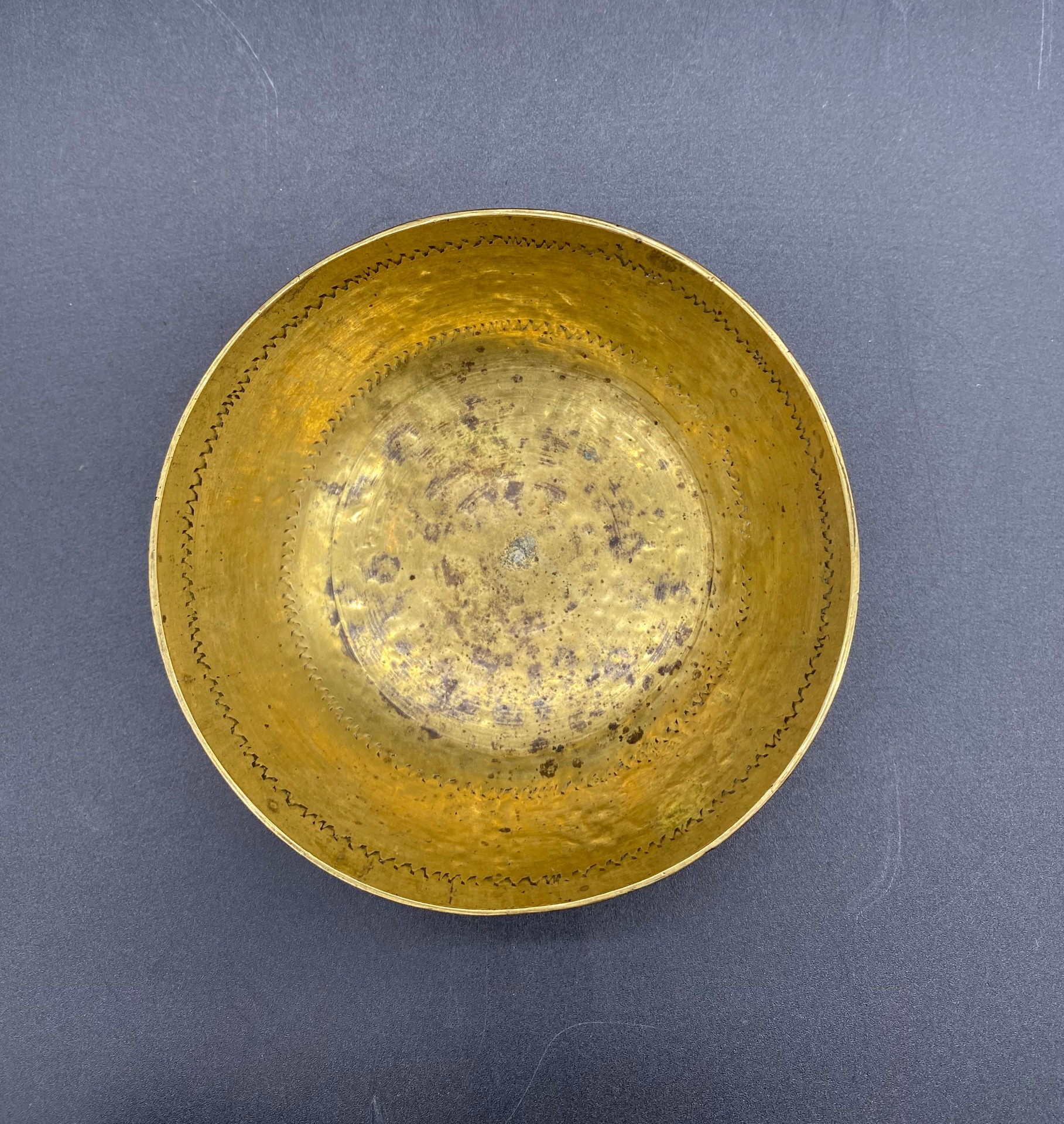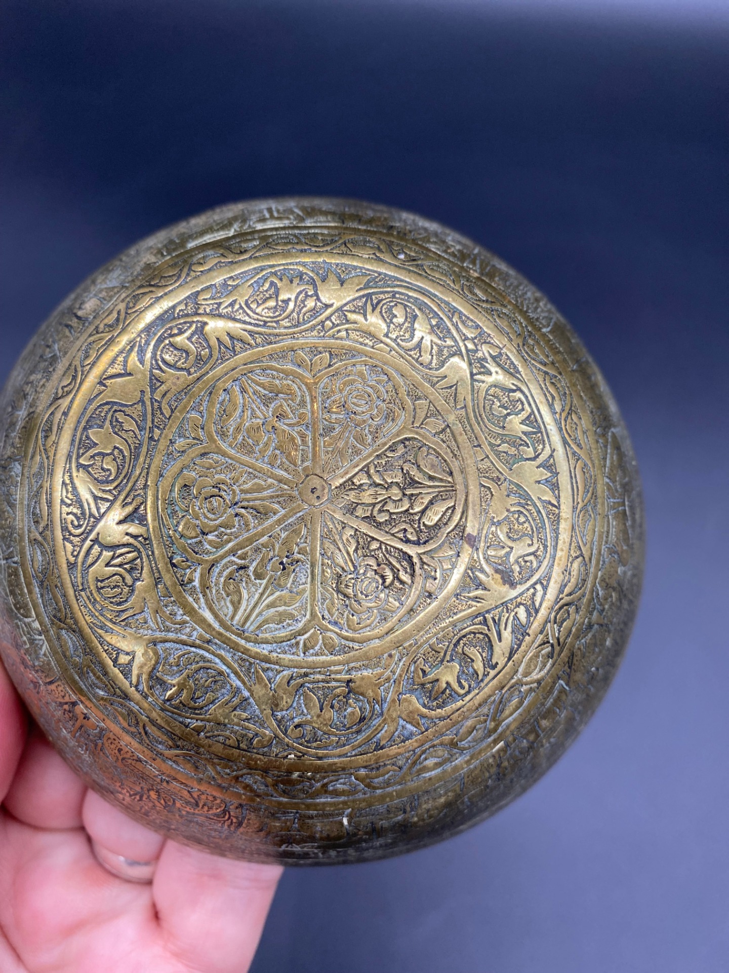 Een elegant oosters antiek messing kommetje, fijn gegraveerd en rijk aan karakter. De warme glans van het messing en de subtiele decoratieve patronen benadrukken het authentieke vakmanschap. Een charmant en sfeervol object dat perfect tot zijn recht komt in een smaakvol interieur of een bijzondere verzameling. Diameter 11 cm