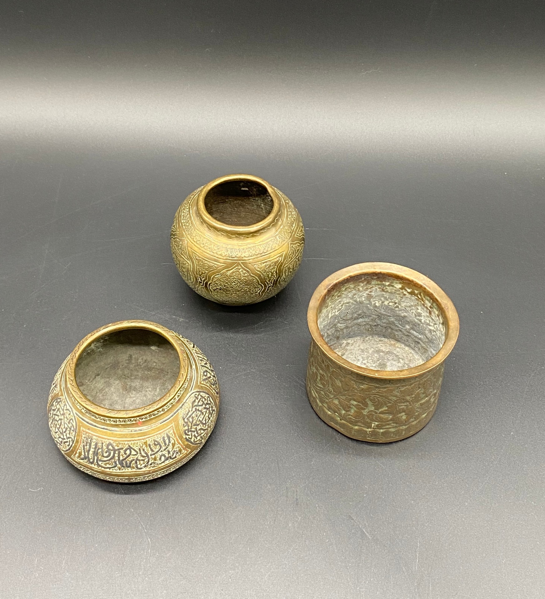 Een prachtige set fijn bewerkte metalen potjes met een uitgesproken oosterse uitstraling. Elk potje getuigt van verfijnd handwerk en subtiele decoratie, waardoor de set een elegante en tijdloze charme krijgt. Een bijzonder decoratief ensemble dat warmte, karakter en een vleugje exotische mystiek toevoegt aan elke ruimte — ideaal voor verzamelaars en liefhebbers van authentiek antiek vakmanschap. Hoogte: 9 cm en 10 cm